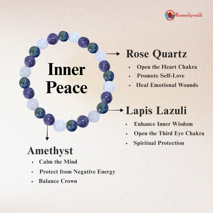 The Promoting Inner Peace Bracelet blends the calming power of Amethyst, the nurturing energy of Rose Quartz, and the wisdom of Lapis Lazuli. Together, they encourage harmony, emotional healing, and a deeper sense of peace.