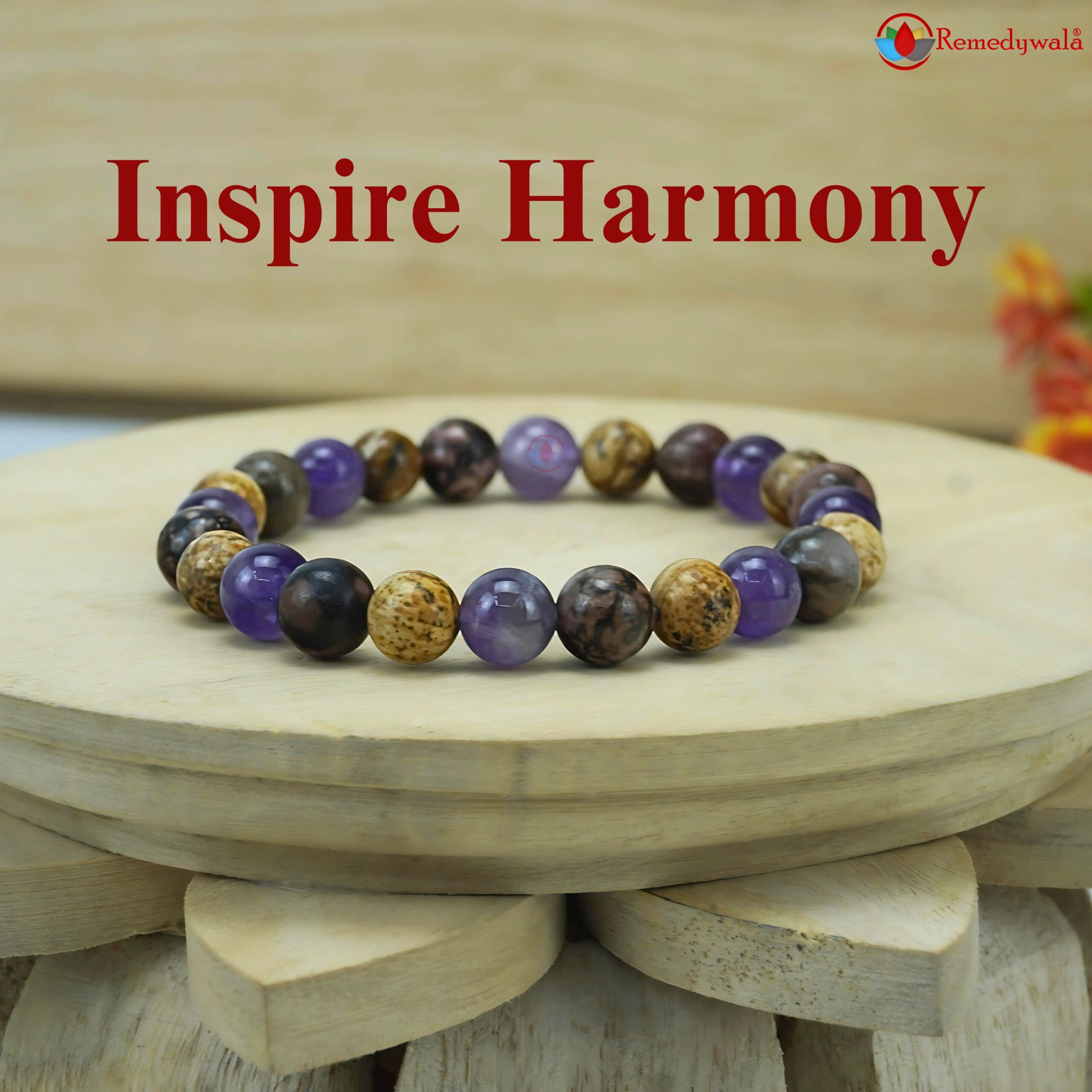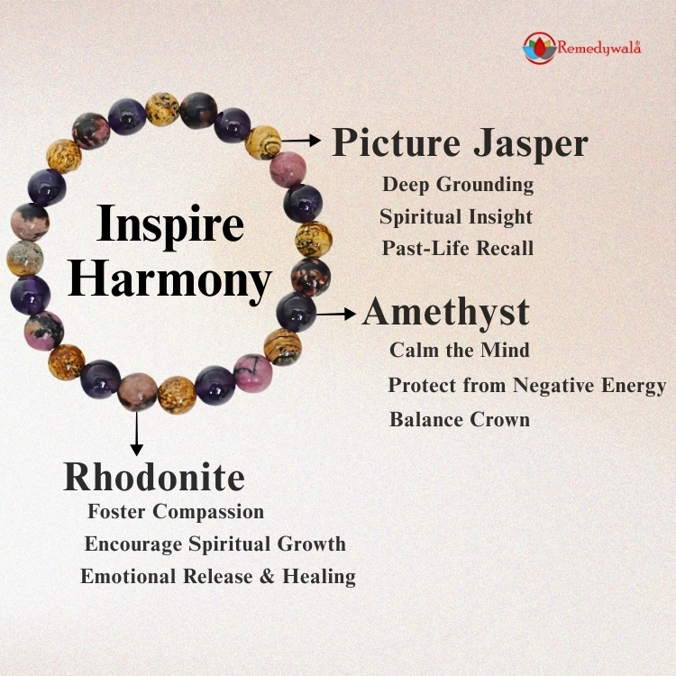The Inspire Harmony Bracelet combines the grounding energy of Picture Jasper, the calming power of Amethyst, and the healing nature of Rhodonite. Together, they inspire balance, emotional healing, and harmony in life.